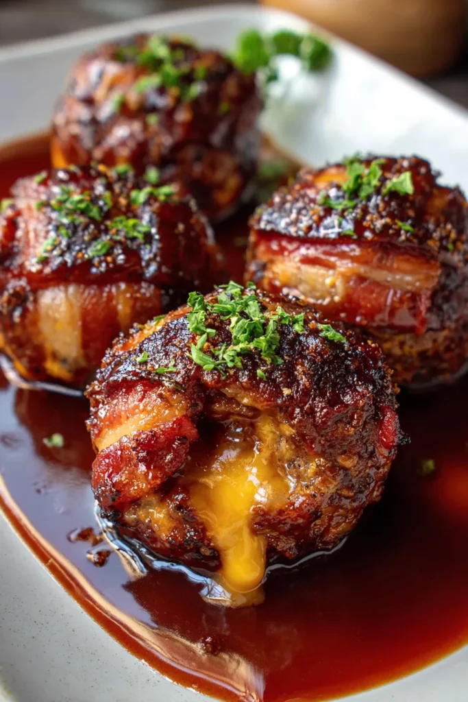 These Cheddar-Stuffed BBQ Bacon Bombs bring a burst of flavor with every bite. Ground beef and savory barbecue sauce envelop melty cheddar and crispy bacon for a crowd-pleasing snack.