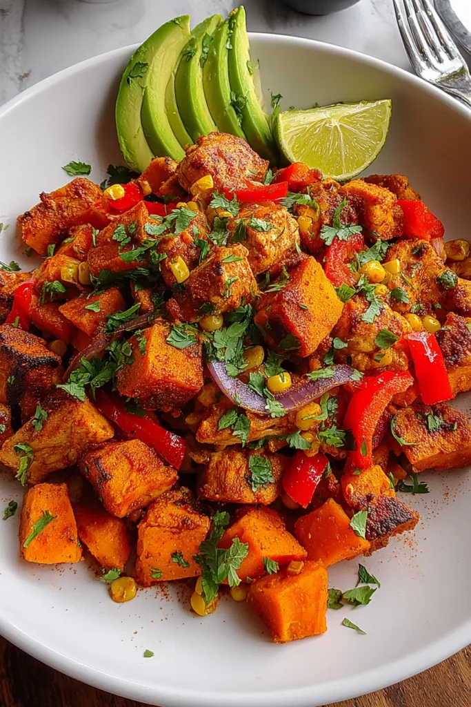 Serve the chili lime sweet potato chicken mixture with fresh lime wedges and optional avocado slices.