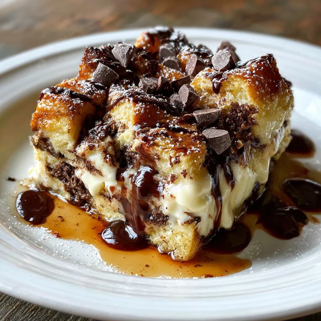 Warm, gooey bread immersed in silky chocolate custard, studded with melty cream cheese bites and topped with a delicate crisp. Each forkful offers a harmony of rich cocoa, creamy tang, and buttery warmth.