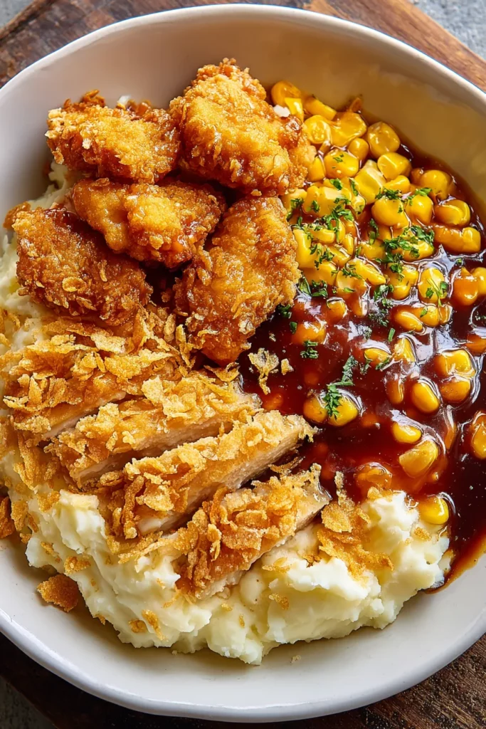 Experience layers of creamy mashed potatoes, crispy fried chicken, sweet corn, melted cheese, and savory gravy all in one bowl! Perfect for a comforting meal.