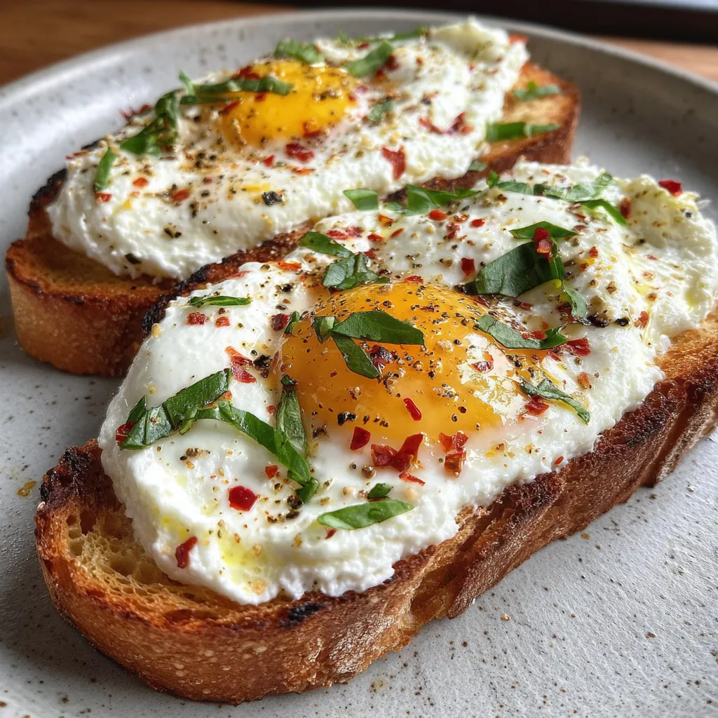 With just a handful of pantry staples and a little oven magic, this Creamy Ricotta Egg Toast proves that delicious brunch doesn’t need fuss. The interplay of crunchy sourdough, silky cheese, and a luxuriously runny yolk creates layers of texture that feel fancy but are total comfort food. A pinch of red pepper flakes and a scattering of fresh herbs add personality and color, making every bite Instagram-ready. Feel free to print this recipe and tuck it into your weekend menu rotation—then let me know how your own creations turned out or share any tweaks that made it even better. Happy to help with questions or cheer on your kitchen adventures!