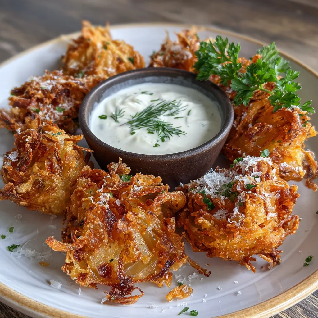 Each onion blooms into a lacework of golden crunch, its petals crackling as they meet the fork. Dip into a velvety buttermilk ranch spiked with dill and parsley for a refreshing, savory bite that balances heat and cool in every mouthful.