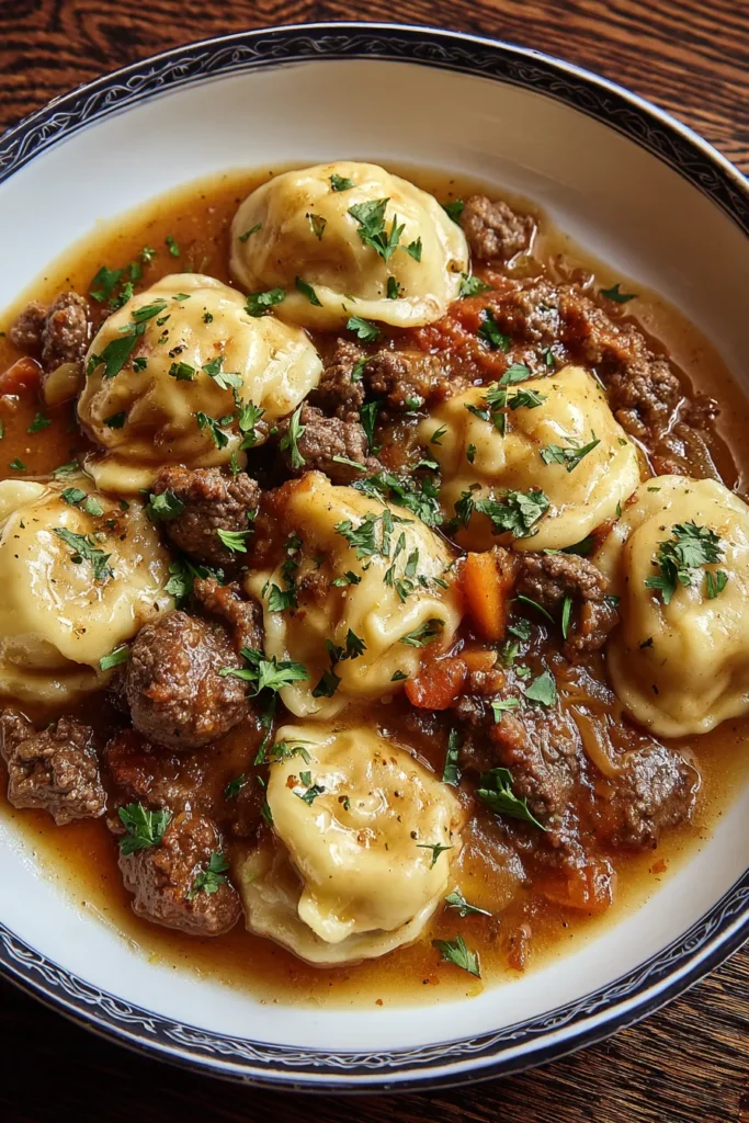 This cozy dish combines savory ground beef with fluffy dumplings in a flavorful broth, making it a family favorite that warms the soul. Perfect for any night!