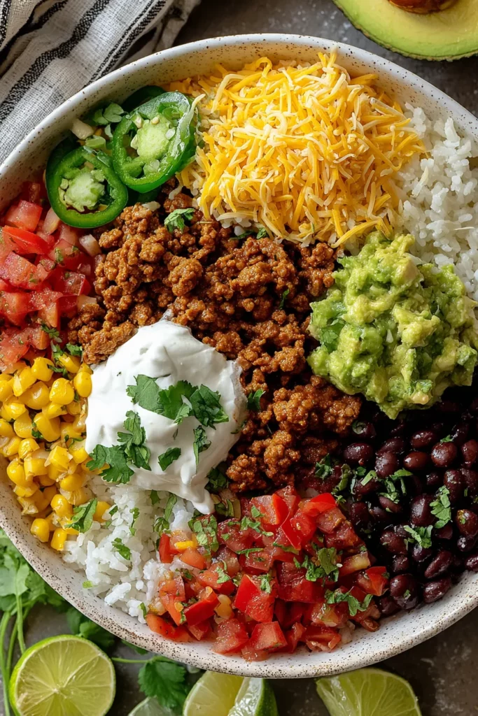 Think shredded cheese, sour cream, diced avocado, chopped cilantro, lime wedges, and jalapeños. Each adds richness, freshness, or heat to customize your perfect bowl.