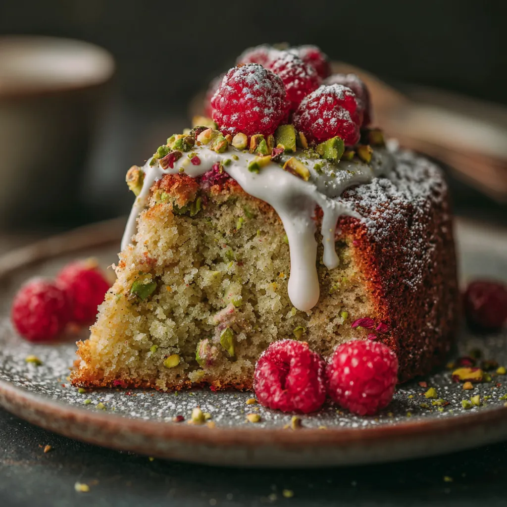 Soft, pistachio-infused cake layers offer a tender crumb and nutty aroma, while vibrant raspberries create bursts of tart sweetness. Crowned with airy whipped cream and a shower of crunchy pistachio bits.