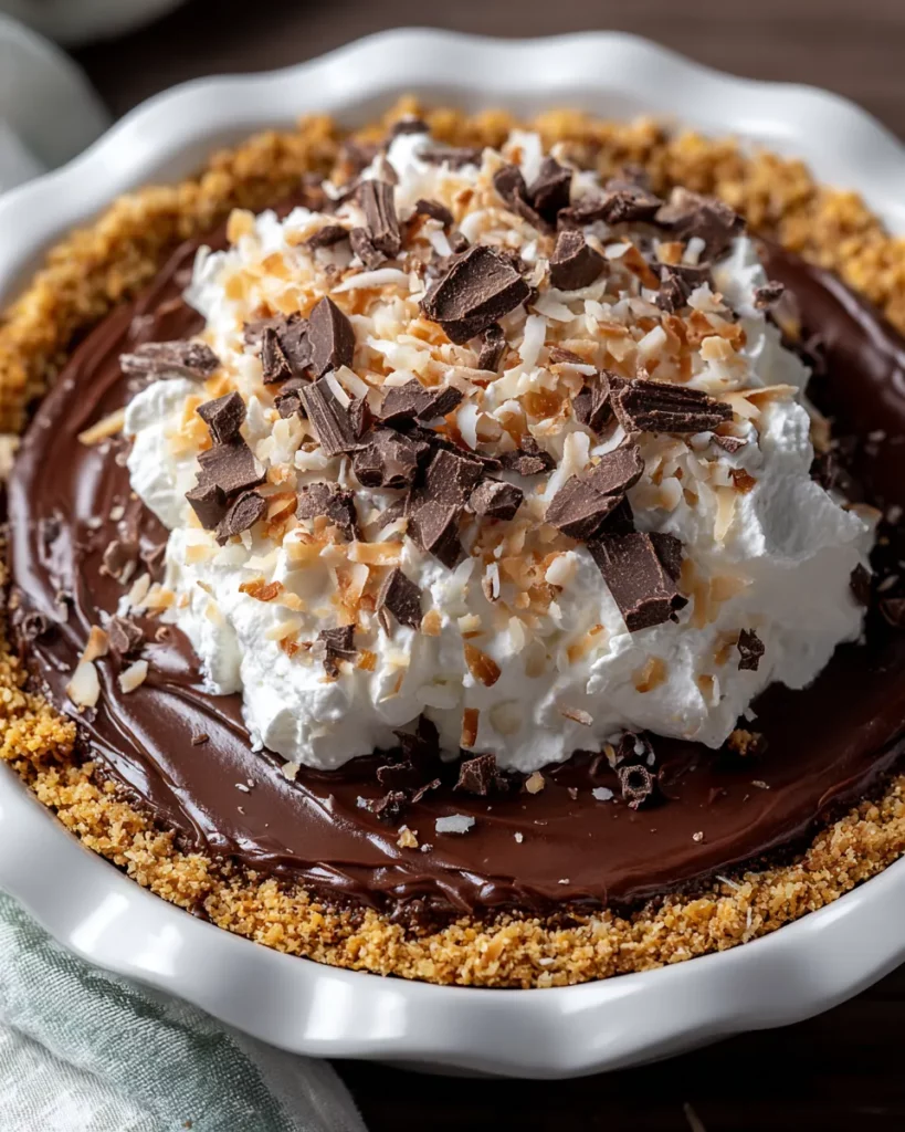 This creamy, no-bake pie combines rich chocolate, sweet coconut, and crunchy pecans atop a graham cracker crust, making it a perfect dessert for any occasion.
