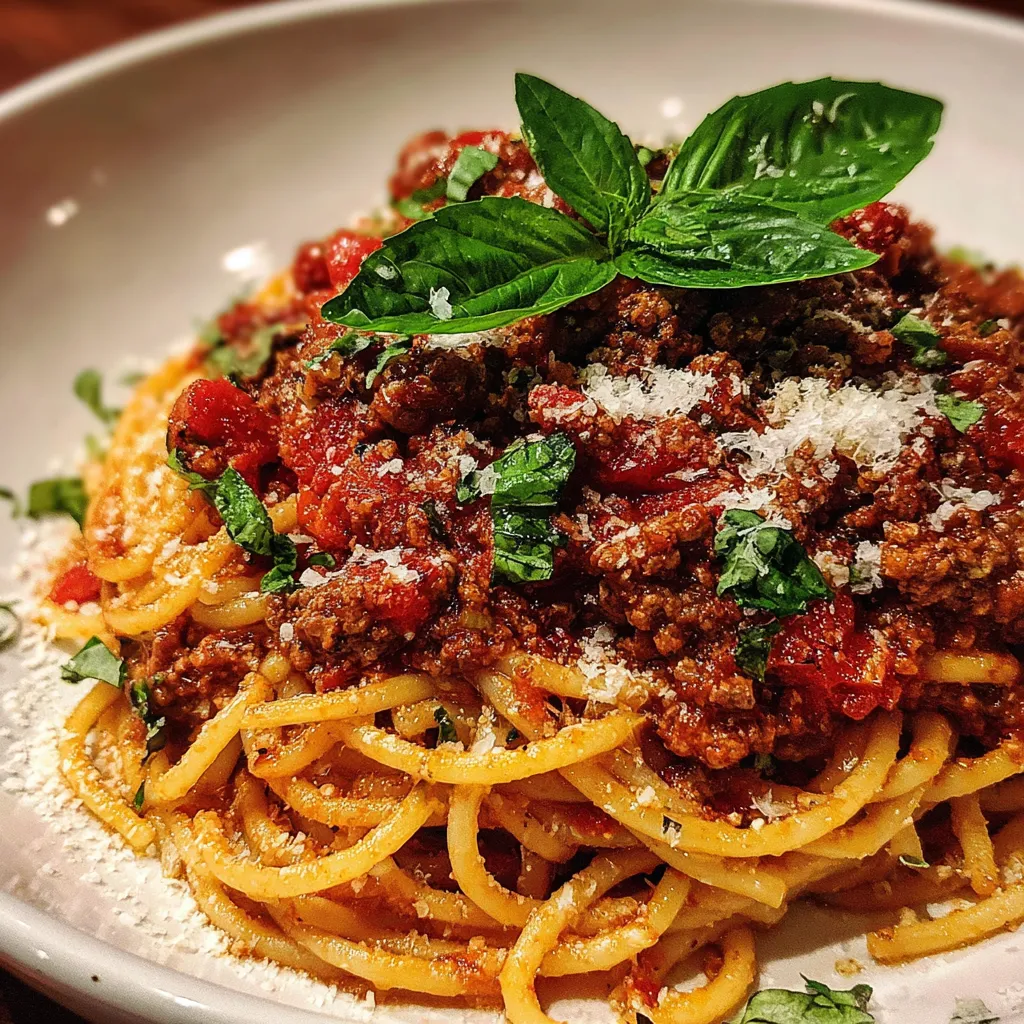 A steaming plate of al dente spaghetti cloaked in a savory tomato-beef sauce, fragrant with garlic, herbs, and a splash of red wine. Topped with fresh basil and Parmesan for a truly comforting bowl.