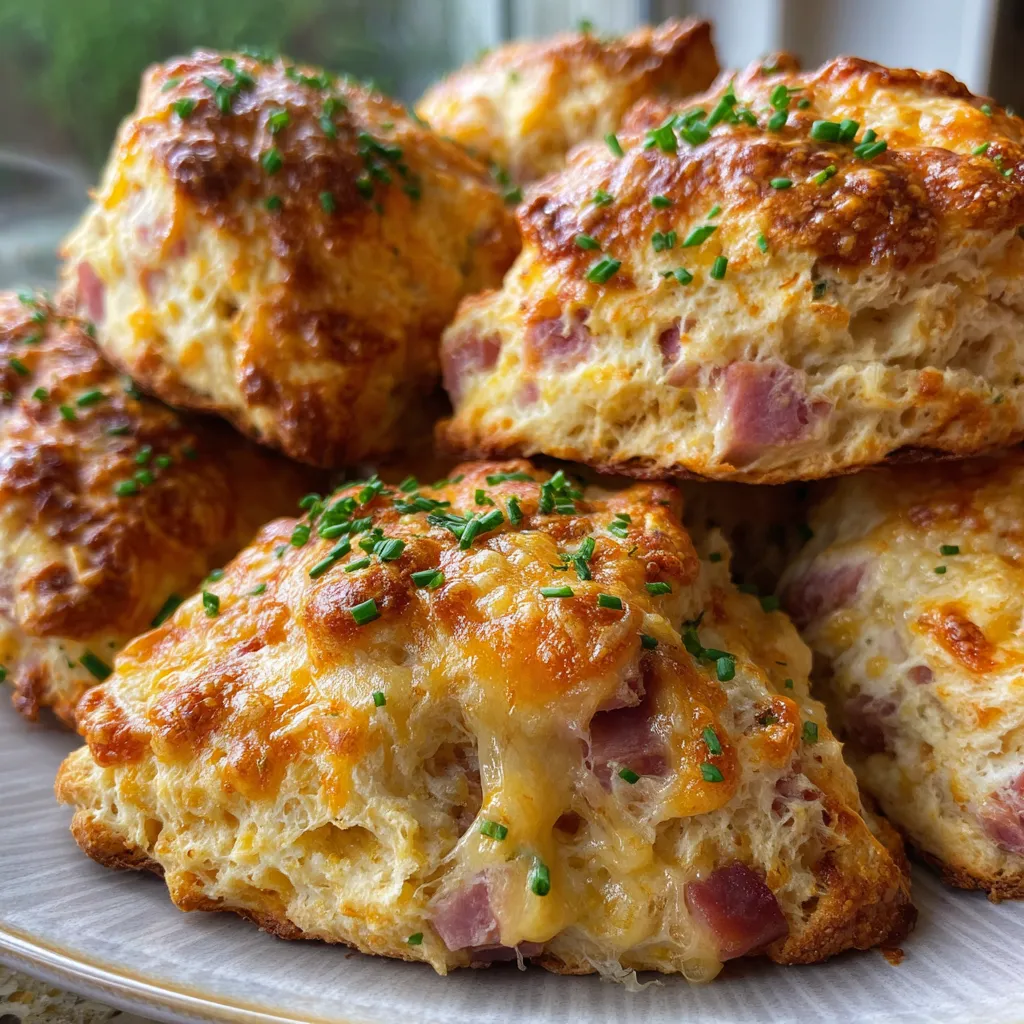 Flaky, golden scones sprinkled with fresh chives hold gooey cheddar and savory ham in every tender bite. A simple mix-and-shape method yields warm, buttery pastry perfect for a hearty morning or midday pick-me-up.