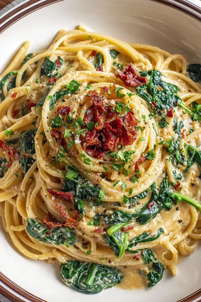 Every forkful of spaghetti coated in a luxuriously creamy sun-dried tomato sauce, studded with wilted spinach, is like a warm hug after a long day. The silky strands of pasta cling to every drop of sauce, the sun-dried tomatoes lending a tangy sweetness that contrasts beautifully with the earthy spinach. Close your eyes and you’ll feel the gentle caress of heavy cream mingling with sharp Parmesan, creating a velvety texture that coats your tongue. This is the kind of dish that transforms an ordinary weeknight into a mini celebration—no fancy gadgets required, just a skillet, some simple pantry staples, and a willingness to dive into a comforting plate of pasta.