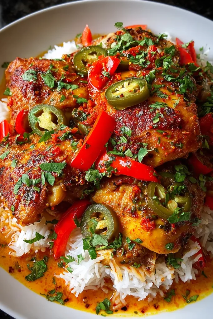 11. Serve the spicy Brazilian coconut chicken over a bed of hot, cooked rice, spooning extra sauce and peppers on top.
