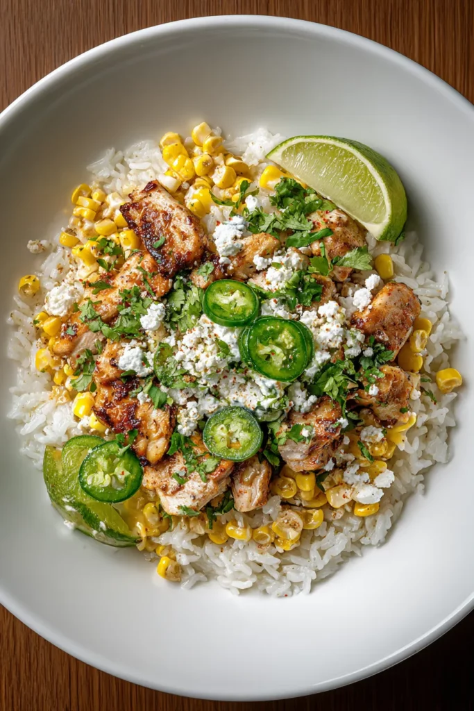 What started as a simple idea—to combine smoky grilled chicken, tangy lime crema corn, and fluffy rice—turns into a dinner that feels like a celebration every time you make it. We’ve walked through ingredient highlights, step-by-step instructions, and thoughtful tips for serving and storage, all designed to give you confidence in the kitchen. This Street Corn Chicken Rice Bowl is versatile enough for casual weeknights yet festive enough to share with friends at a backyard gathering. Pin this recipe, print it out, and tuck it into your recipe binder—you’ll want to revisit it again and again. Remember, you can swap ingredients to suit your pantry or dietary preferences, and you’ll still end up with that signature balance of creamy, spicy, and bright.